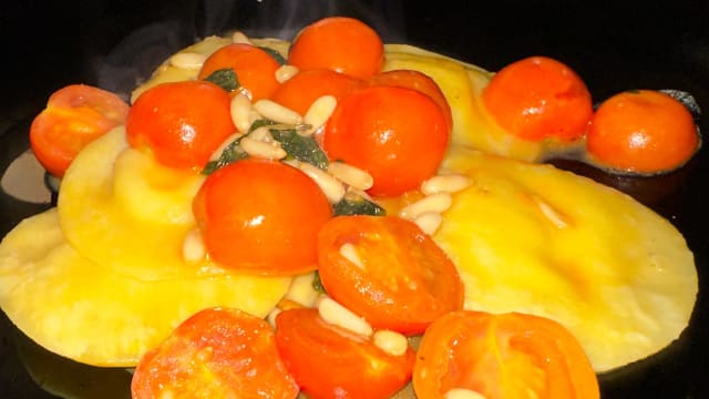 Spadellata di totani e fagioli con erbe aromatiche e pomodorini