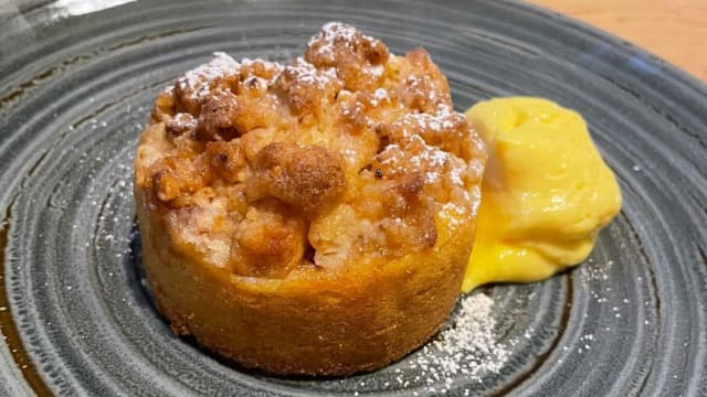Tartelletta di frolla ripiena di mele spadellate alla cannella, in cima crumble alle nocciole, servito caldo con crema pasticcera alla vaniglia del Madagascar