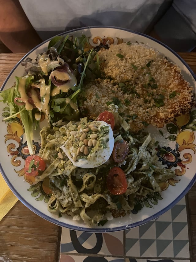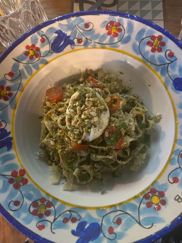 - Pasta al pesto verde, stracciatella, mortadelle, pignons, graines de courge et pistaches