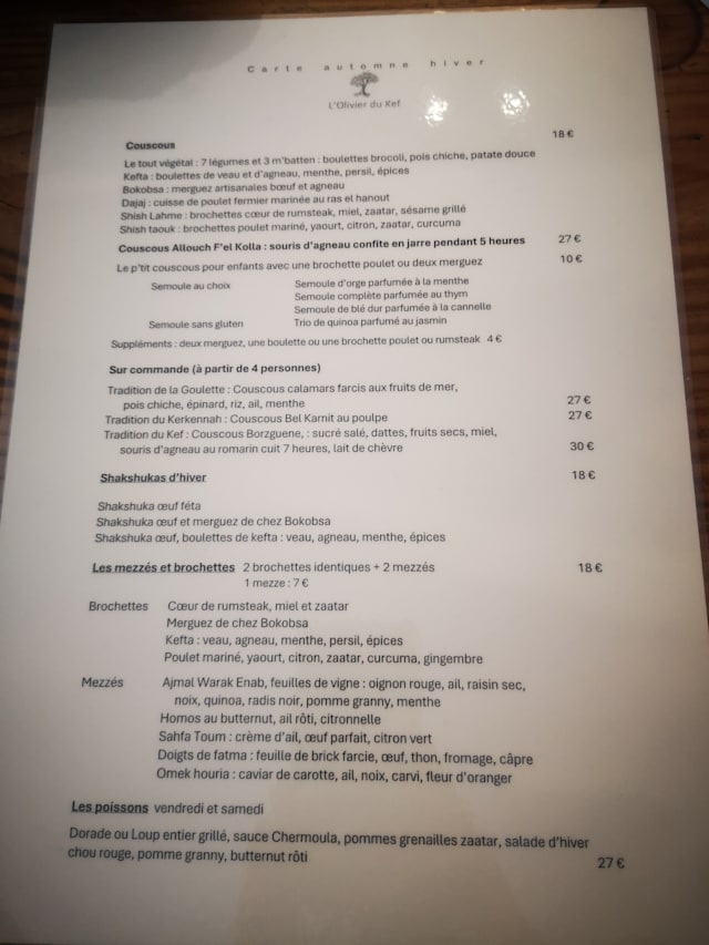 FusionMediterraneanTraditional cuisineCouscousBachelor partyBistroBistronomicCommunionContemporary cuisineCreativeGood for a business lunchGood for familiesLunchOrganicRomanticSeminarTraditionalWith friendsGluten freeLactose intoleranceNut allergiesPeanut allergyVegan dishesVegetarian dishesAmerican ExpressChildren's menuDog-FriendlyWheelchair AccessibleWifi