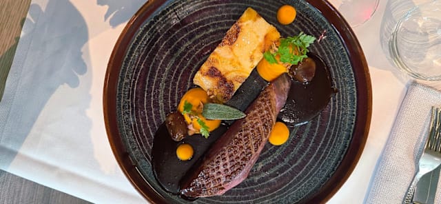 Pressé de pommes de terre, mousseline de potimarron et jus corsé au miel.
