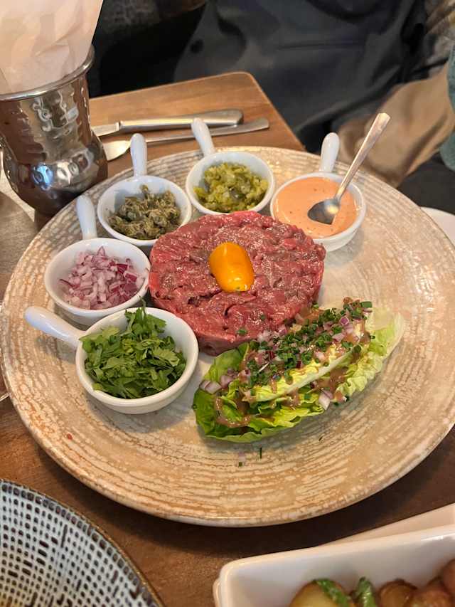 - Le tartare de bœuf taillé au couteau, frites maison et cœur de laitue
