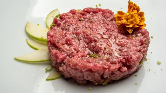 Tartare di manzo maionese alla senape e confettura di pomodoro