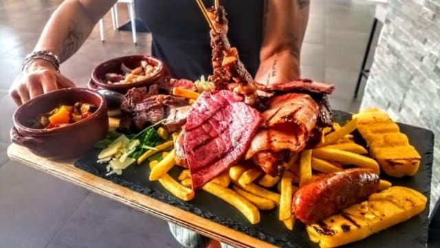Costine, salsicce e filetto di maiale cotti a bassa temperatura (cbt) e brace, tagliata di bruna alpina selezione impera con rucola e petali di grana, arrosticini abruzzesi, pancetta stufata,, patate fritte, fagioli con cipolla, pomodori e cetrioli, polenta.