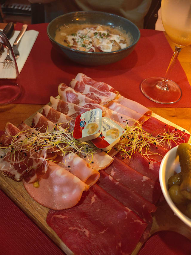 7/10Plan at the beginning was to eat a fondue for dinner, but people serving at table did not know the type cheese used. She asked to the kitchen, but we decided to move for pizza&dessert. Both of good quality.