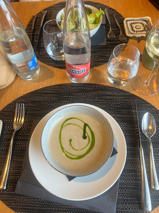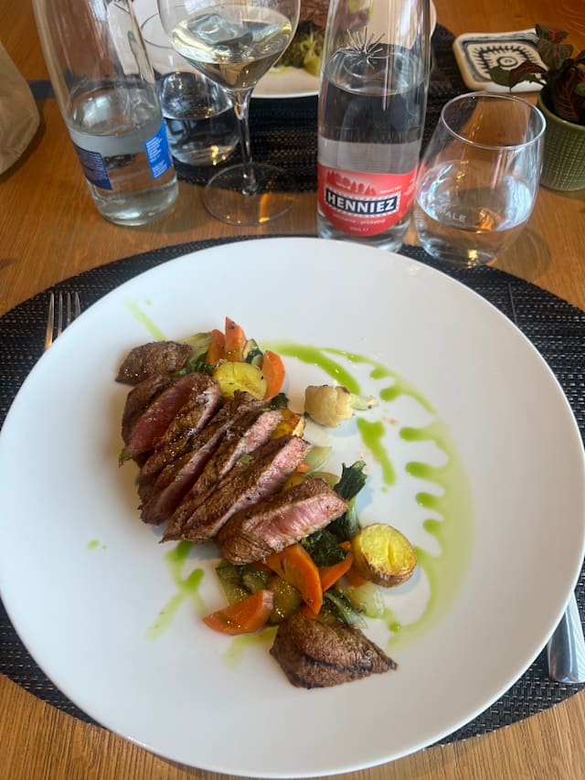 Entrecôte de bœuf Suisse, échalotes confites maison, mousse de fromage de chèvre, poêlée d’asperges vertes