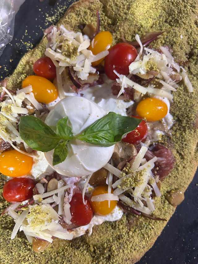 - Crema di pistacchio, fiordilatte, prosciutto cotto, cipolletta grana, granella di pistacchio