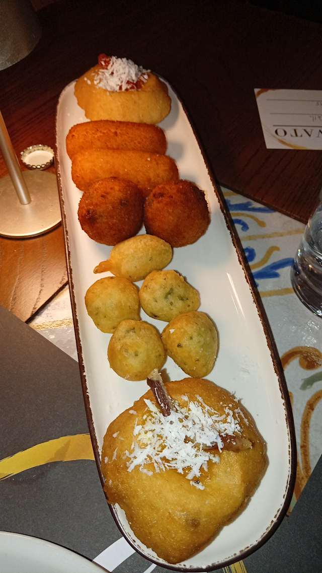 - Crocchè di patate, arancini di riso rossi, zeppole alle alghe di mare e bis di montanare fritte con: datterini gialli di battipaglia, guanciale e pecorino piennolo del vesuvio, ricotta stagionata e basilico fresco