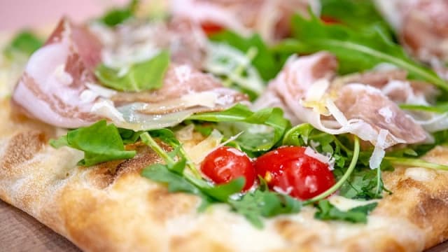 Fiordilatte campano, datterini rossi, in uscita prosciutto crudo, rucola e scaglie di grana