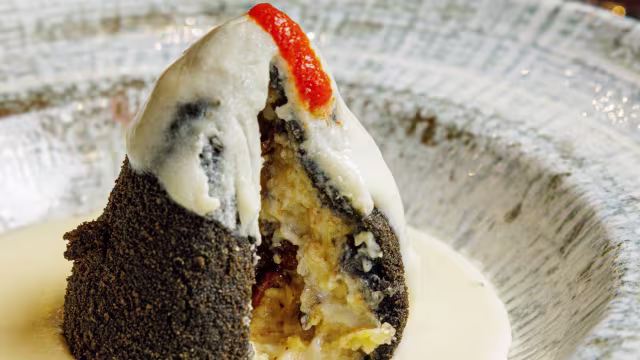 - “Etna” finto arancino di patata ripieno di funghi porcini, al profumo di tartufo e fonduta di caciocavallo ragusano DOP