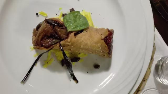 - Iris “crò” ripieno di mortadella di asino ragusano, salsiccia e ricotta di pecora su salsa di pistacchio in purezza