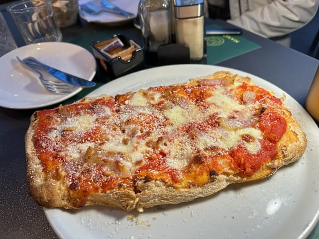 Tomatoe sauce, mozzarella cheese, pig cheek, roman pecorino cheese and parmesan cheese