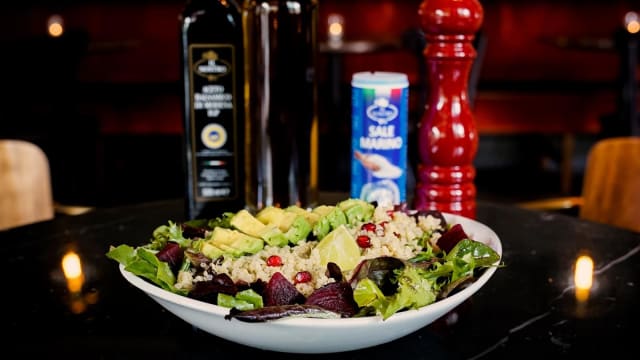 - Mélange de jeunes pousses, mélange de quinoa et de grenade, betteraves rouges, tomates cerises, avocat, sauce maison
