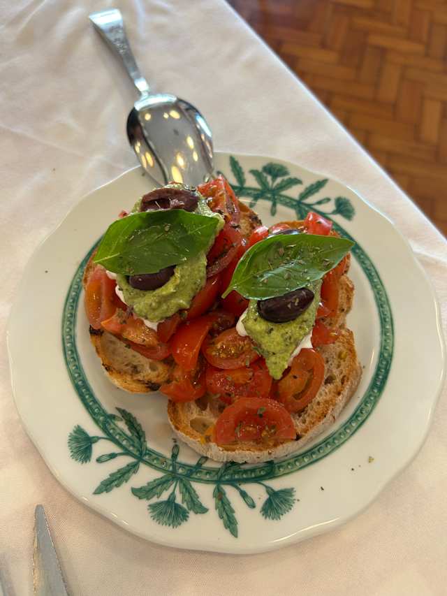 - Pão torrado com tomate cherry, burrata, pesto de mangericão e azeitonas