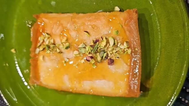 Feuilles de filo émiettées, mélangées avec un mélange de yaourt, œufs et zestes d'orange, le tout imbibé de sirop à l'orange une fois cuit.