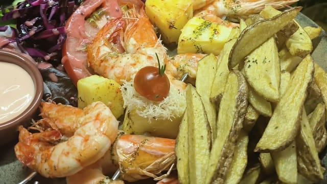 Espetada de camarão e abacaxi (c/batata frita e mayo)
