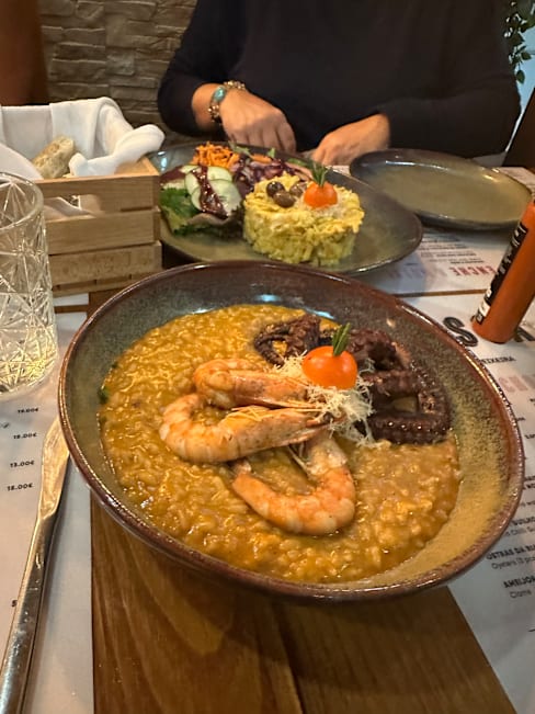 10/10Wonderful seafood—we had sea bass with clams and octopus and shrimp risotto. Cute place tucked in somewhat below a hilly street with good prices too. We may return for lunch if we have time (note Apple Maps showed the restaurant only open in evening but we were informed they are also open from 1200 - 1500).