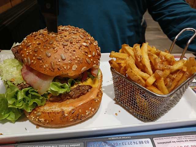 - 1 plat : hamburger (steak haché 150g pur boeuf, cheadar. Ketchup, mayonnaise) ou steak hache