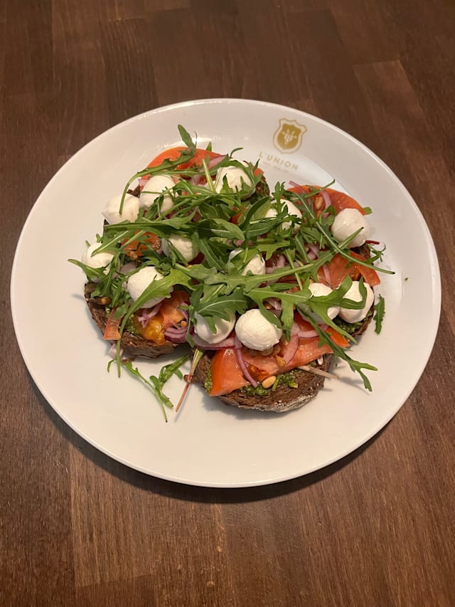 - Mozzarella, groene pesto, rode ui, tomaat, rucola