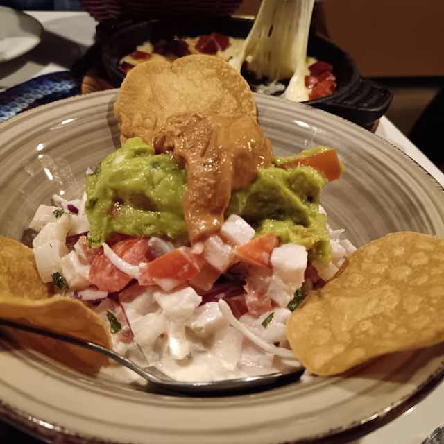 - Pez espada cocido con limón acompañado con cebolla, cilantro, tomate y aguacate, con salsa receta de la casa y toping de crema de cacahuate