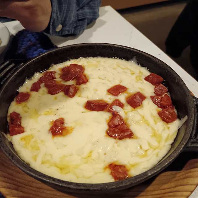 - Queso fundido con chorizo acompañado con tortillas de trigo