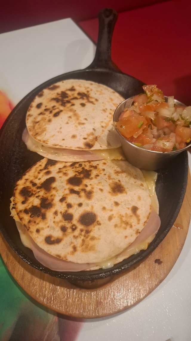 - 2 Quesadillas con tortilla de trigo, jamón York, frijoles, crema, guacamole. Acompañada con pico de gallo