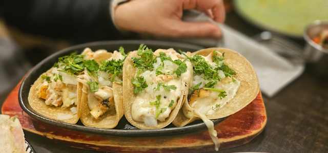 - Tortillas de maiz rellenas de pollo banadas con poblano, cebolla y ajonjoli.