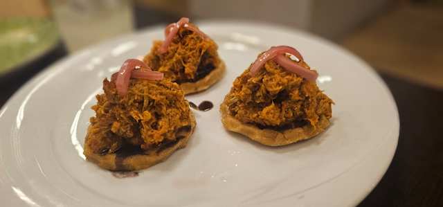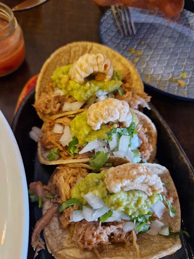 - Base de maiz nixtamalizado (3) hechas a mano con frijol. cochinita, pibil y cebolla morada.