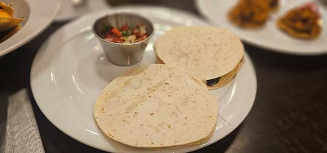- Gran quesadilla de tortilla de maiz hecha a mano con bistec de ternera y chorizo, acompanado con guacamole.