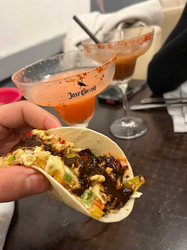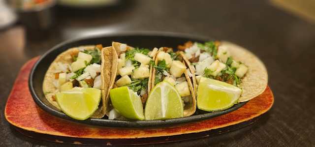 - Quesadilla de tortilla de trigo reliena de carne al pastor con cebolla cilantro y pina.