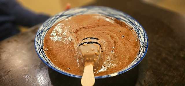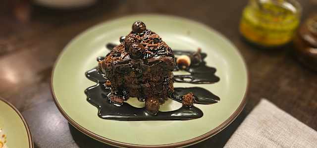 - Helados de chocolate fundido sobre una cama de nutella con una bola de helado de vanillia espolvoreado de frutos rojos liofilizados.