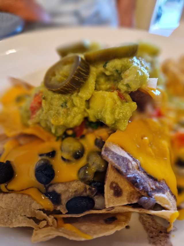 - Totopos con queso cheddar, queso tipo chihuahua, frijoles, guacamole, pico de gallo y jalaoenos.
