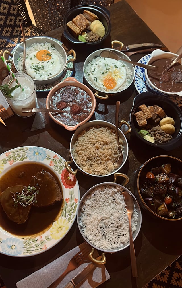 Cazuela de frijoles tradicional colombiana con chorizo, morcilla, acompañada de arroz blanco y huevo a baja temperatura, con carne molida, mini arepas, plátano maduro frito, flor de aguacate y chicharrón