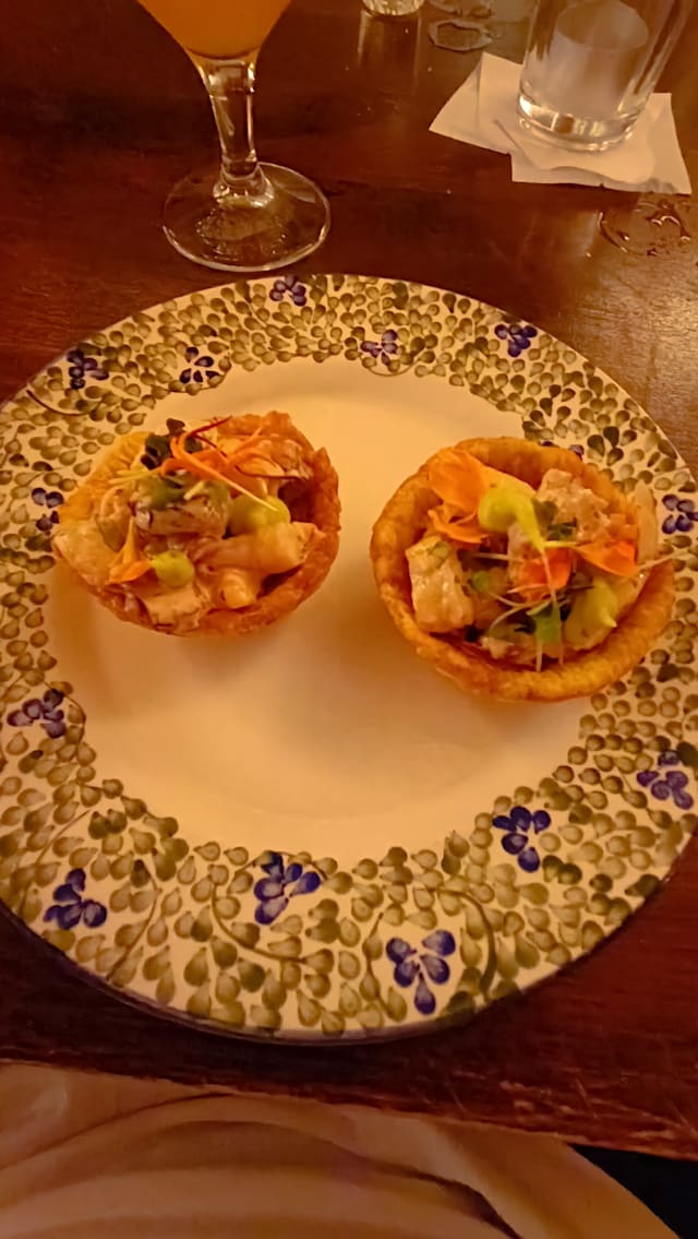 Arroz guisado, pasta de cilantro y ají amarillo, salteado con mariscos y coronado con un ceviche fresco y crema de bisquet
