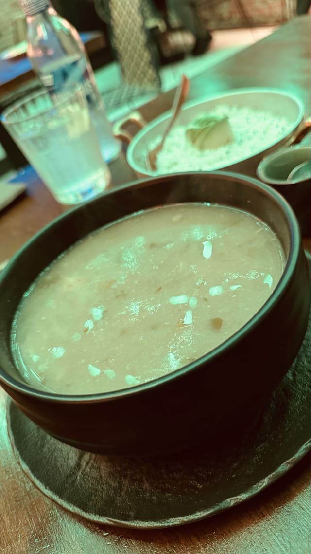 Arroz cremoso cocido con leche de coco, mezclado con pulpo, langostinos,mejillones y crujiente de coco