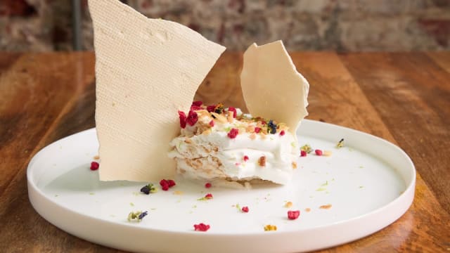 Versión del napoleón terminado en mesa con crumble, frambuesa deshidratada, pétalos de flores, teja de merengue y ralladura de lima