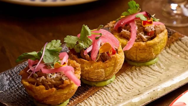Tacos de cerdo desmechado servidos con crema de aguacate, cilantro, mayo spicy, cebolla morada y gajo de lima