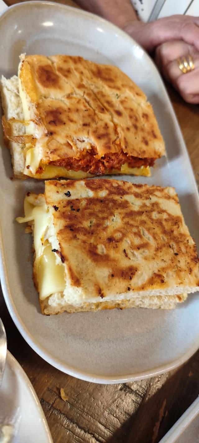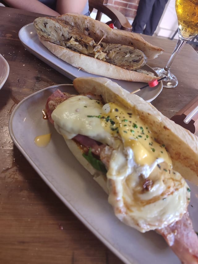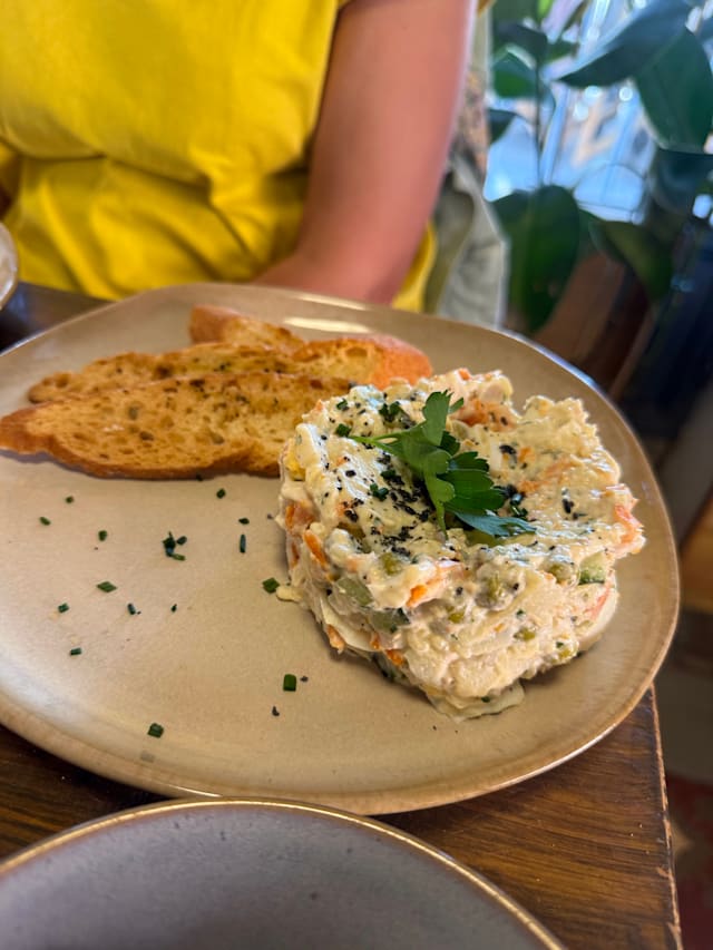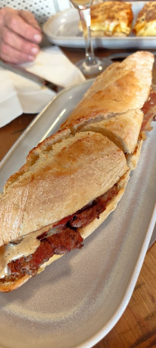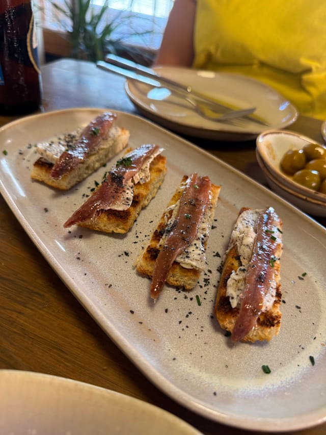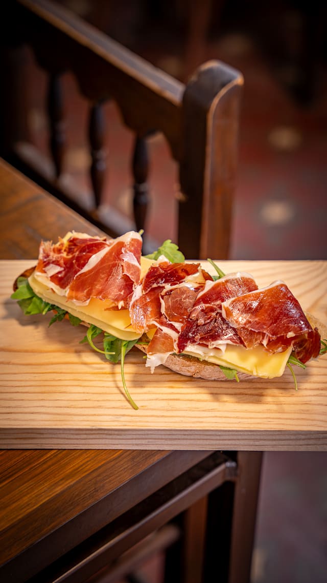 Autenticidad valenciana sobre pan crujiente. Pimientos asados, bacalao desmigado y ajo, aliñados con buen aceite de oliva y coronados con huevo duro rallado. Un clásico de la huerta y el mar, sencillo y lleno de sabor.