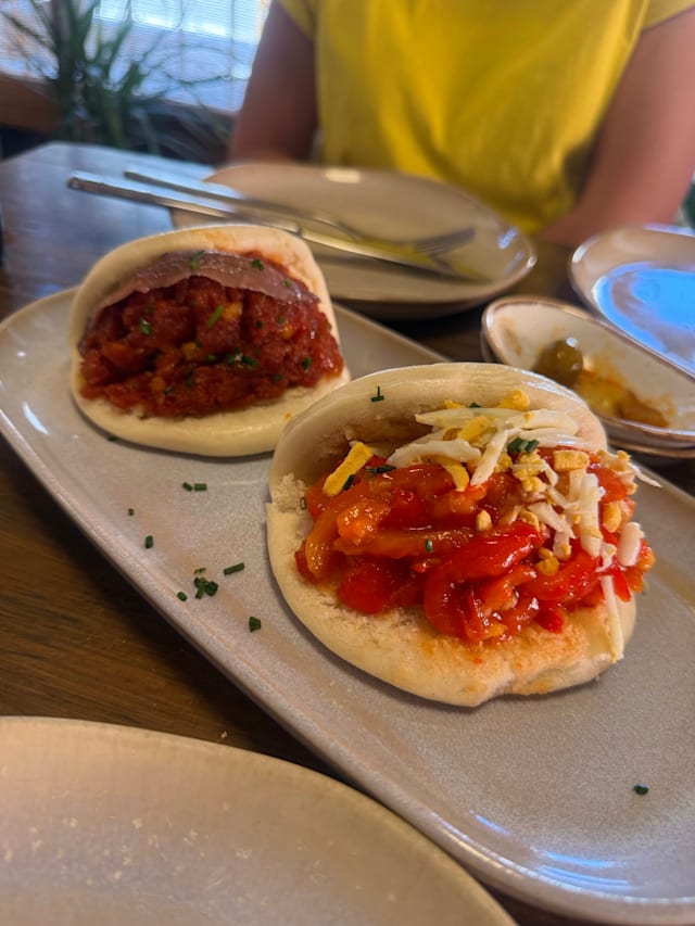 Tradición valenciana en pan asiático. Pimientos asados, bacalao desmigado y ajo aliñados con aceite de oliva, servidos en pan bao al vapor y coronados con huevo