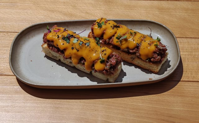 Dos finas tostadas de focaccia con steak tartar de ternera aliñado al momento y yema curada con un toque de miel. Una combinación delicada de intensidad, suavidad y dulzor sutil, servida en formato para disfrutar sin prisas.