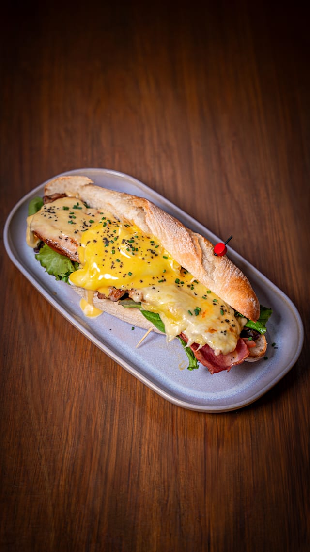 Clásico bocadillo español con un giro aromático. Tortilla de patata con un toque de trufa, servida entre pan crujiente. Sencillez tradicional elevada con un sabor profundo e irresistible.