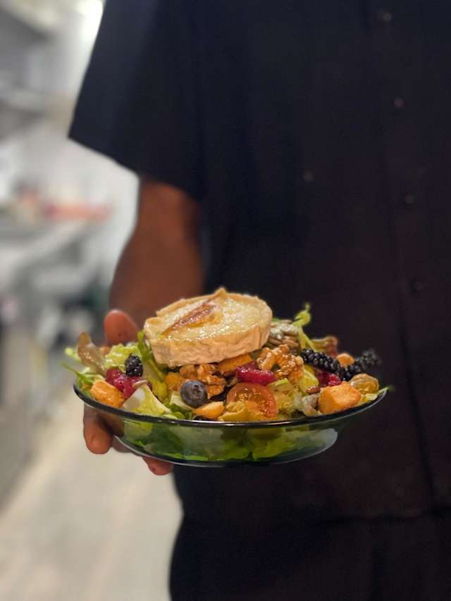 - Mezclun de lechugas, queso de cabra km0 artesano, croûtons, tomate cherry, aguacate, melocotón y vinagreta de miel.
