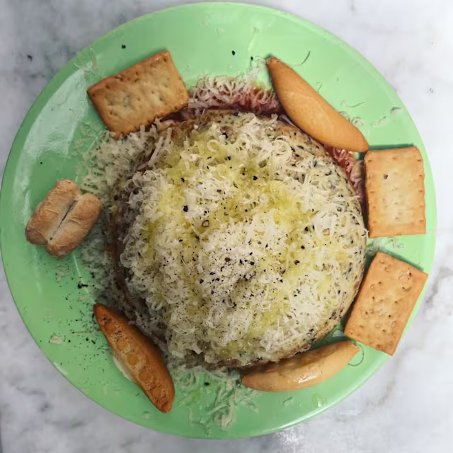 - Albóndigas de carne de ternera y cerdo con pecorino romano, tomate san marzano y parmigiano acompañado de focaccia.
