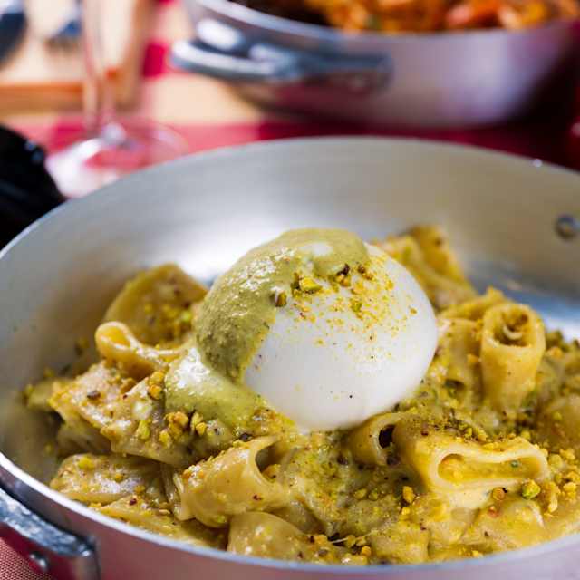 - Mezze maniche al pesto di pistacchio e burrata pugliese