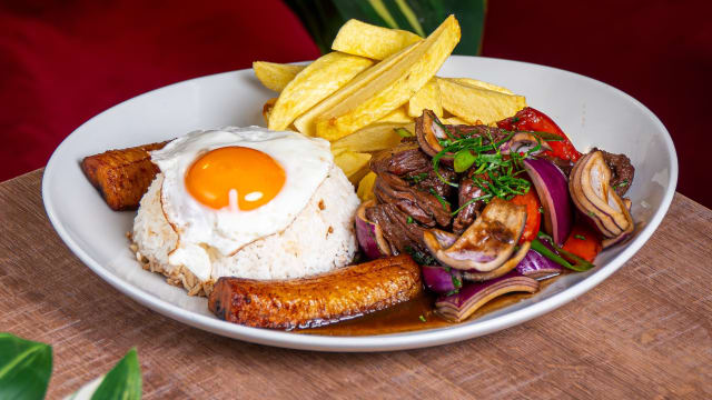 Lomo saltado acompañado con patatas, plátano maduro, arroz y huevo frito.