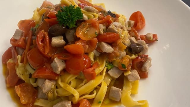 Spaghetto "selezione mancini" al tonno fresco, caponata di melanzane, olive, acciughe e ricotta stagionata