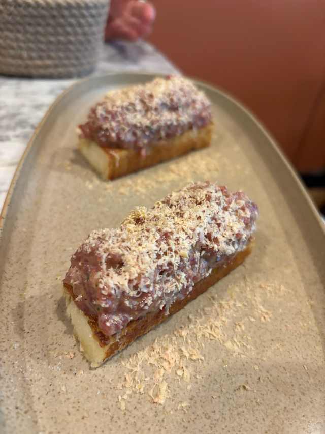 - Mini brioche de steak con foie en escabeche rallado