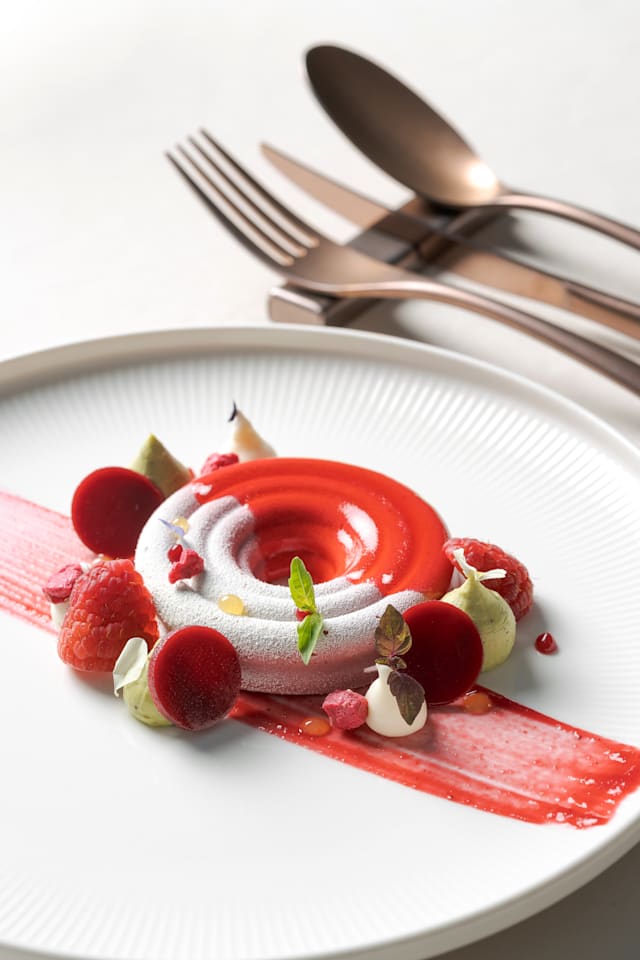 Mousse al lampone, crema morbida al kefir, ganache al pistacchio e gelatina ai frutti rossi