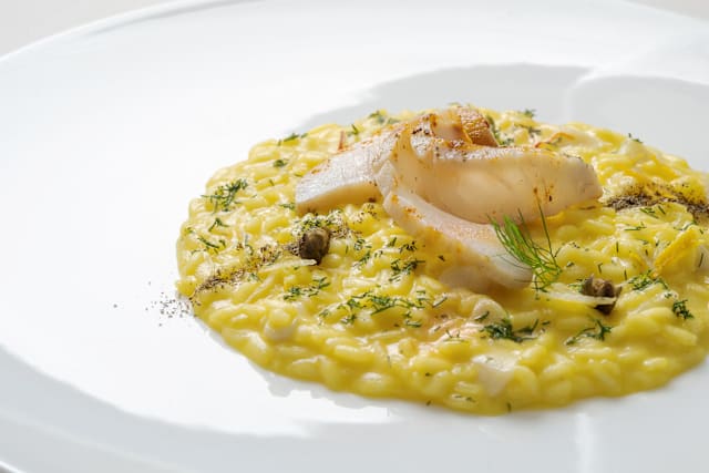 Riso carnaroli riserva “san massimo”, orata agli agrumi, zafferano e polvere di capperi