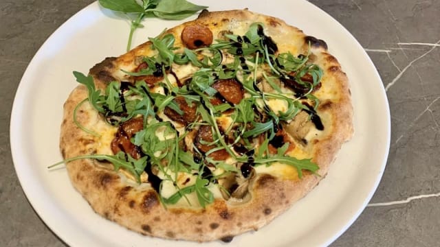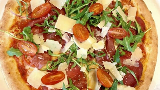 - Crème de truffe, mozza, jambon blanc italien, burrata, tomates cerises, roquette et pignons